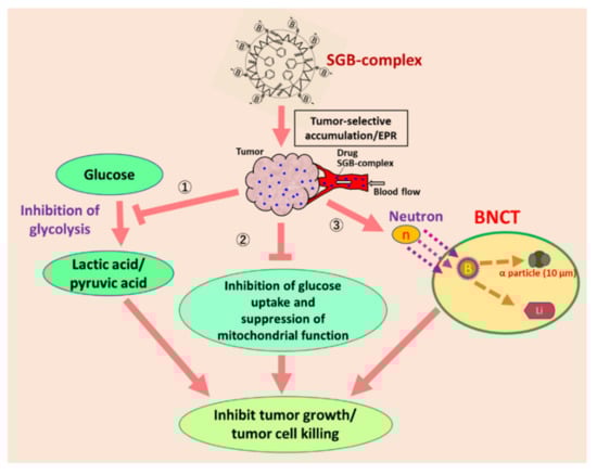 The SGB complex has multiple actions in addition to the generation of α-particles such as the inhibition of glycolysis; see reference [] for details, and Figure 6. Similar to glucosamine, one can conjugate BPA to the SMA polymer, and similar results will be expected, but neither inhibition of glycolysis (suppression of lactic acid formation), nor damage to mitochondria are expected. Preliminary data for neutron irradiation in vitro and in vivo were validated: tumors shrunk without any effects on skin or on toxicity in the liver and kidney, or on blood counts. I can thus envision new possibilities for BNCT with boron nanomedicines, where a new wave is coming.
