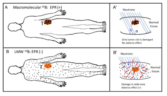 Body distribution of boron-containing drugs. (A) Body distribution of a macromolecular 10B compound (e.g., SGB-complex). (B) Distribution of an LMW 10B compound. In (A), boron-containing micelles such as the SGB-complex accumulates predominantly in tumor tissue (T), with the accumulation being about 10 times greater than that of a LMW compound or all other normal tissues in (B). (A’,B’) at right represent enlarged views of the neutron irradiation sites. In (A’), only tumor tissue is damaged: boron micelles (back dots) are evident only in the tumor (T). In (B’), neighboring normal tissue to tumor the boron compound are distributed in most normal tissues such as skin, which will be then be damaged. Red specks around black dots indicate the area of emission of α-particles. (B’) shows that a wide area of tissue is damaged in (B’) (adverse effect).