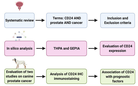 Schematic representation of the study design. (1) Systematic review of the previous literature and selection of manuscripts evaluating prognostic significance of CD24 in human prostate cancer. (2) In silico analysis to evaluate CD24 expression in prostate cancer compared to normal prostate (as found by Gene Expression Profiling Interactive Analysis (GEPIA)) and association between CD24 and patients’ survival (GEPIA and The Human Protein Atlas (THPA)). (3) Retrieval of CD24 immunohistochemistry slides from two previous veterinary studies and re-evaluation of the CD24 expression in association with clinical pathological characteristics. Figure generated in BioRender (www.biorender.com, accessed on 15 November 2020).