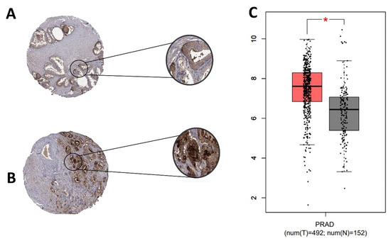 CD24 gene and protein expression in human prostate cancer. (A): Tissue microarray (TMA) core from a normal human prostate gland. Normal glandular cells show moderate membranous and cytoplasmic expression. (B): A TMA core from a human prostate cancer, with a strong CD24 expression in the membrane and cytoplasm of neoplastic cells. (C): CD24 overexpression in prostate cancer samples compared to normal samples (* p > 0.01). Image credit of the immunohistochemistry images: Human Protein Atlas, www.proteinatlas.org. Image available at the following URL: https://v20.proteinatlas.org/ENSG00000272398-CD24/tissue (accessed on 15 November 2020). The gene expression dotplot was generated using GEPIA database (http://gepia.cancer-pku.cn/about.html, accessed on 15 November 2020). PRAD: Prostate cancer dataset.