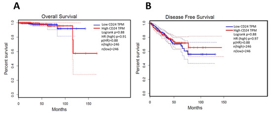 Survival analysis of human patients according to CD24 expression. (A): CD24 expression is not associated with overall survival of human prostate cancer patients. (B): the disease-free interval is not associated with CD24 expression. The survival curves were generated using the GEPIA database (http://gepia.cancer-pku.cn/about.html, accessed on 15 November 2020).