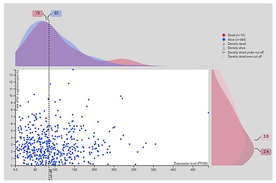 Survival association according to the CD24 fragments per kilobase of exon model per million reads mapped (FPKM). The median of CD24 FPKM in the group of dead human patients is 78 and in the group of living human patients is 83. There is no significant association between CD24 expression and overall survival (p > 0.05). Image credit: Human Protein Atlas, www.proteinatlas.org accessed on 15 November 2020. Image available at the following URL: https://v20.proteinatlas.org/ENSG00000272398-CD24/pathology/prostate+cancer#, accessed on 15 November 2020.