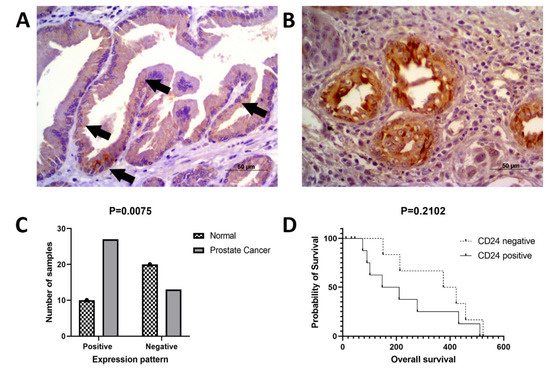 CD24 immunoexpression in canine prostate cancer. (A): multifocal cytoplasmic CD24 expression (arrows) in a normal prostate considered positive for CD24. (B): canine prostate cancer showing diffuse cytoplasmic and membranous CD24 expression by neoplastic cells. (C): CD24 overexpression in canine prostate cancer compared to normal prostate. (D): Survival analysis according to CD24 expression. Dogs with CD24 positive expression showed a tendency to lower survival compared to dogs with CD24 negative expression.