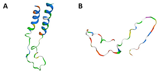 CD24 tertiary protein structure in dogs (A) and humans (B). Human and canine CD24 proteins showed a 90% similarity among amino acid sequence and also similar tyrosine kinase domains. Figures generated in Swiss model online tool (https://swissmodel.expasy.org/, accessed on 15 November 2020).