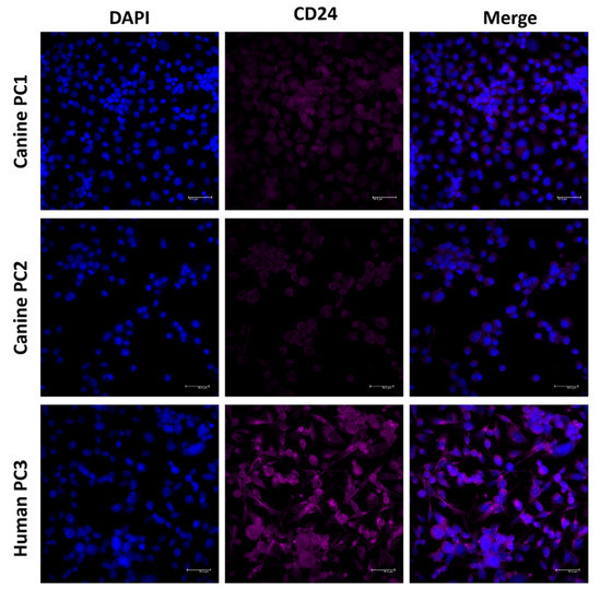 The canine prostate cancer cell lines (PC1 and PC2) and the human prostate cancer cell line (PC3) were used to investigate CD24 expression by immunofluorescence. The canine PC1 and PC2 cell lines were previously established and characterized by our research group [4] and the human prostate PC3 cell line was retrieved from the European Collection of Authenticated Cell Cultures (ECACC). The canine cell lines were used at passage 20 and the human PC3 cell line was used at passage 17. The immunofluorescence procedures were performed according to the previous literature [4]. Briefly, round sterile 1.5 coverslips were placed on 12-well plates (Sigma, Portland, OR, USA) at 1×105 cell density. Then, 250 μL of culture medium (DMEM F12, Lonza, Basel, Switzerland) supplemented with 10% FBS containing the cells were incubated in a humidified atmosphere of 5% CO 2 at 37 °C. The mouse monoclonal CD24 antibody (Santa Cruz Biotechnology, Dallas, TX, USA) was used as primary antibody and the rabbit anti-mouse Alexa Fluor 594 (BioLegend, San Diego, CA, USA) was applied at a 1.5 μg/mL dilution in PBS for 60 min as a secondary antibody. The slides were counterstained with 4 ′-6-diamidino-2-phenylindole (DAPI; Sigma, Portland, OR, USA) and visualized on a confocal microscope (Leica, Wetzlar, Germany).