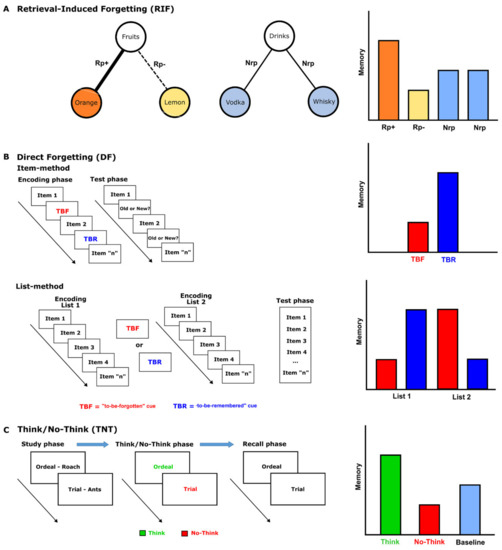 Schematic representations and procedural overview along with the typical pattern of findings of (A) the semantic retrieval-induced forgetting (RIF) paradigm, (B) item and list-methods for studying directed forgetting (DF), and (C) the think/no-think task (TNT).