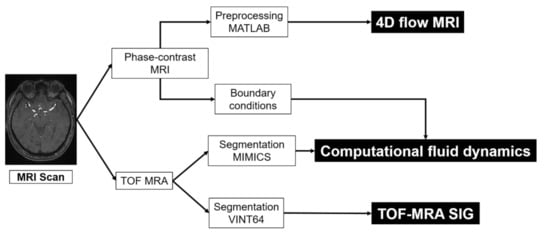 The study method is illustrated in Figure 1. We used phase-contrast MRI (PC MRI) source data for the subject-specific 4D flow MRI study. The TOF-MRA source data were segmented and converted into 3D geometry for CFD simulations. The velocity obtained from the 4D flow MRI analysis was applied to CFD simulations as the boundary conditions. The TOF-MRA SIG was performed based on the TOF-MRA images. 4D flow MRI was used for measuring the blood flow velocity. Both CFD and 4D flow MRI were performed to visualize the 3D blood flow characteristics. Additionally, CFD and TOF-MRA SIG were used to represent the arterial WSS.