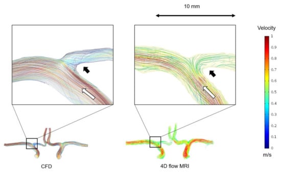 3D blood flow characteristics of the cerebral arteries obtained from CFD and 4D flow MRI. The major flow structures (white arrow) and the recirculation regions (black arrow) observed in the CFD coincided with those in 4D flow MRI. The same velocity scale bar with color was applied for all the images ranging from 0–1 m/s.