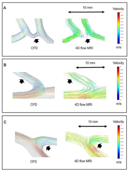 In the 3D blood flow pattern visualized by CFD and 4D flow MRI in this study, the results identified several differences as the primary limitation in using 4D flow MRI is the spatio-temporal resolution. The limited spatial and temporal resolution leads to an insufficient number of velocity data points within the fluid flow from which to estimate model parameters []. As a result, 4D flow MRI visualization displays poorer complex flow patterns quality compared with CFD models, i.e., more parallel flows, less swirling, and fewer transition flows in the ICA bifurcation.