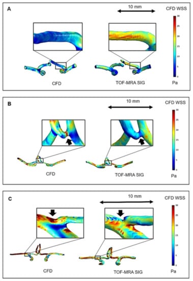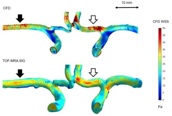 Despite CFD being currently the best approach for WSS analysis, its limitations have been noted [,]. Wey assumed that the vessel walls were rigid, reducing CFD processing complexity. However, in reality, the arterial wall is not rigid and is known to have inherent elasticity, which reduces the WSS []. Therefore, the discrepancy of WSS estimations derived by the two methods may not just be due to the lower resolution of TOF-MRA SIG, but may also be related to a relative overestimation of the CFD simulation.