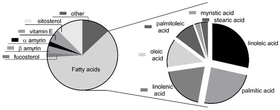Considering the important role of polyunsaturated fatty acids in skin growth and protection, we conducted a few experiments in order to estimate the composition of the tested sea-buckthorn seed oil. Linoleic acid was the main component (28.5% of the total fatty acid content), followed by palmitic acid (24.4%), linolenic acid (19.7%), oleic acid (12.6%) and palmitoleic acid (9.2%). Only small amounts of myristic and stearic acid were found in the tested oil (2.3 and 3.2%, respectively). A general screening of the volatile constituents of seed oil was also performed by using gas chromatography–mass spectrometry (GC/MS). Based on the total peak area, fatty acids represented 61% of the volatile compounds, with the other main components being sitosterol (12.4%), vitamin E (6.2%), α- and β-amyrin (2.14 and 3.3%, respectively) and fucosterol (1.96%) (Figure 1). The distribution of fatty acids was similar to that assessed by LC/MS.