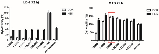 Cytotoxicity was assessed by cellular lactate dehydrogenase (LDH)release (CytoTox 96 Non-Radioactive Cytotoxicity Assay, Promega, Madison, WI, USA). Specifically, 10,000 cells were seeded in triplicate overnight in 96-well plates and incubated the next day with serial dilutions of stock solution for an additional 72 h. Two controls were included—a negative control (cell culture medium only) and a positive control (addition of Cell Lysis Reagent 10x, Promega, 45 min prior to LDH detection). For background subtraction, additional triplicates of cell-free wells were incubated with tested solutions. For LDH analysis, 50 µL of supernatant were collected from each well and incubated with assay reagent for 30 min in the dark. After the addition of stop solution, absorbance was read at 490 nm by using a microplate reader Anthos Zenyth 3100 (Wals, Austria). Cytotoxicity was assessed as a percentage of the positive control, according to the formula cytotoxicity = 100*(Sample OD − background OD)/(average positive control − average background).