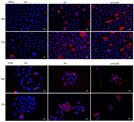 Next, we tested whether irradiation affects oil uptake into cells. Keratinocytes use lipids to seal the epidermis from the outer environment by deposition of sphingolipids in the extracellular space [18]; therefore, a normal degree of lipid inclusion is to be expected in non-treated cells. Both normal and dysplastic cells uptake presented increased lipid load following oil treatment. However, unlike normal cells, where only some cells are loaded with lipid inclusions, all dysplastic cells have a degree of lipid load. Irradiation did not significantly affect the upload of lipids in both normal and dysplastic cells, but dysplastic cells showed a more uniform lipid uptake (Figure 5).