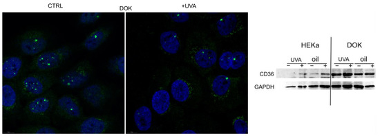 CD36 expression in normal (HEKa) and dysplastic (DOK) keratinocytes after UVA irradiation. Expression of CD36 in both HEKa and DOK cells was assessed by confocal immunofluorescence and confirmed by Western blot. In basal conditions, CD36 expression in normal keratinocytes is undetectable with the selected methods. Its expression increases in dysplastic cells, as well as following UVA irradiation.