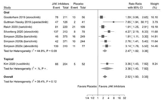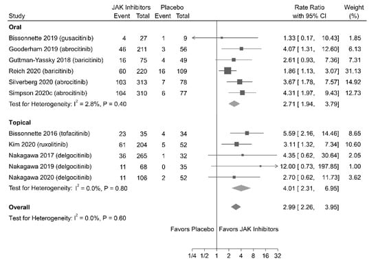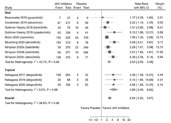 Since their first approval, JAK inhibitors have become a promising AD treatment option [16]. In randomized controlled trials (RCTs), several JAK inhibitors (oral/topical) have significantly improved the clinical outcomes of patients with inadequate responses to other therapies [17,18]. An integrated safety analysis indicated similar incidences of adverse events (AEs) between JAK inhibitor application and placebo [19]. An earlier meta-analysis showed that JAK inhibitors lowered the eczema area and severity index (EASI) and pruritus scores [20]. Nevertheless, the sample sizes of the enrolled studies were small, and no phase III RCTs were included [20]. Considering the rapid developments in this field of study, an updated literature review with a meta-analysis is warranted to improve statistical power and provide supporting evidence for current guidelines.