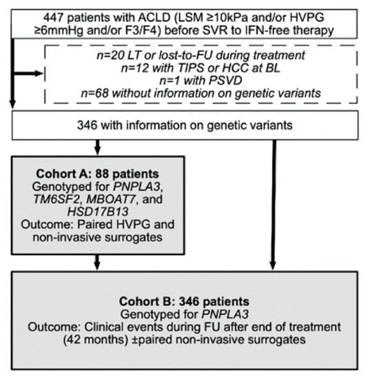 All patients who underwent IFN-free treatment at the Medical University of Vienna between 1 January 2014 and 31 July 2019 and achieved SVR were assessed for eligibility. The study was approved by the ethics committee of the Medical University of Vienna (EK: 1947/2019). Inclusion criteria were: (I) evidence suggestive or confirmative of ACLD (defined by baseline [BL] LSM ≥ 10 kPa, HVPG ≥ 6 mmHg, or advanced liver fibrosis/cirrhosis on histology [25]) and (II) data on genetic variants. Patients were excluded if they had undergone LT before the end of IFN-free treatment or if no clinical FU was available. Moreover, patients in whom a transjugular intrahepatic portosystemic shunt (TIPS) had been placed or who had been diagnosed with hepatocellular carcinoma (HCC) or porto-sinusoidal vascular disease (PSVD) [26] before the end of treatment were excluded. Finally, 346 patients were included (Figure 1).