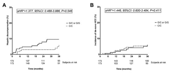 Kaplan–Meier analyses of (A) hepatic decompensation and (B) the incidence of de-novo HCC in the overall cohort (cohort B), comparing carriers and non-carriers of PNPLA3 rs738409 G-allele. * Adjusted hazard ratio (aHR) was calculated using Cox regression analysis adjusting for history of hepatic decompensation, baseline MELD score, and baseline albumin level. Abbreviations: aHR adjusted hazard ratio, HCC hepatocellular carcinoma, HR hazard ratio, PNPLA3 patatin-like phospholipase domain-containing protein.