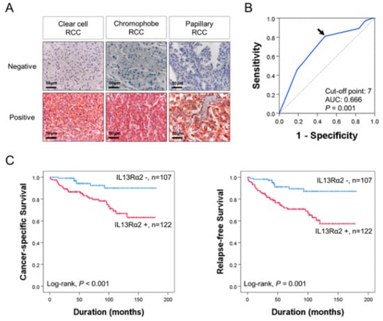 Immunohistochemical expression and survival analysis for the expression of IL13Rα2 in renal cell carcinomas. (A) Immunohistochemical expression of IL13Rα2 in clear cell renal cell carcinoma, chromophobe renal cell carcinoma, and papillary renal cell carcinoma tissue. Original magnification, ×400. (B) Receiver operator characteristic curve analysis to determine the cutoff point of IL13Rα2 immunostaining. The cutoff point is determined to predict cancer-specific survival of renal cell carcinoma patients. The cutoff point has the highest area under the curve (AUC). Arrow indicates a cutoff point for the IL13Rα2 immunostaining. (C) Kaplan–Meier survival analysis for cancer-specific survival and relapse-free survival according to the immunohistochemical positivity for IL13Rα2 in 229 cell renal cell carcinomas.