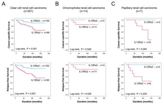 The immunohistochemical staining for IL13Rα2 was seen in tumor cells of all histologic subtypes of RCC (Figure 1A). The cut-off point for IL13Rα2 immunostaining was seven in receiver operating characteristic curve analysis (Figure 1B). The cases have immunohistochemical staining scores equal to, or greater than, seven were grouped as positive for IL13Rα2 staining. In this cut-off value, IL13Rα2-positivity was significantly associated with tumor size (P = 0.004), tumor stage (P = 0.002), histologic nuclear grade of tumor cells (P < 0.001), and histologic subtype of RCC (P = 0.005) in 229 cases of RCCs (Table 1). CCRCC is the major histologic subtype of RCC, and there were 201 cases of CCRCC in this study. Therefore, we also evaluated in CCRCC subgroup of RCCs. In CCRCC subgroup, IL13Rα2-positivity was significantly associated with tumor size (P = 0.005), tumor stage (P = 0.003), and histologic nuclear grade of tumor cells (P < 0.001) (Table 1). In 229 overall RCCs, the factors significantly associated with CCS or RFS in univariate analysis were age (CSS, P < 0.001; RFS, P = 0.005), tumor size (CSS, P < 0.001; RFS, P < 0.001), tumor stage (CSS, P < 0.001; RFS, P < 0.001), lymph node metastasis (CSS, P = 0.615; RFS, P < 0.001), histologic nuclear grade (CSS, overall P = 0.032; RFS, overall P = 0.008), tumor necrosis (CSS, P < 0.001; RFS, P = 0.004), and IL13Rα2-positivity (CSS, P = 0.002; RFS, P < 0.001) (Table 2). The IL13Rα2-positivity showed a 3.726-fold (95% confidence interval [95% CI]; 1.636–8.489, P = 0.002) greater risk of death and a 3.625-fold (95% CI; 1.806–7.278, P < 0.001) greater risk of relapse or death of RCC patients (Table 2). The Kaplan–Meier survival curves for CSS and RFS according to IL13Rα2-positivity in overall RCC are presented in Figure 1C. In 201 CCRCCs, the factors significantly associated with CCS or RFS in univariate analysis were age (CSS, P = 0.004; RFS, P = 0.012), tumor size (CSS, P < 0.001; RFS, P < 0.001), tumor stage (CSS, P < 0.001; RFS, P < 0.001), lymph node metastasis (CSS, P = 0.721; RFS, P = 0.011), histologic nuclear grade (CSS, overall P = 0.170; RFS, overall P = 0.028), tumor necrosis (CSS, P = 0.005; RFS, P = 0.063), and IL13Rα2-positivity (CSS, P = 0.003; RFS, P < 0.001) (Table 2). The IL13Rα2-positivity had a 3.591-fold (95% CI; 1.546–8.342, P = 0.003) greater risk of death from CCRCC and a 3.518-fold (95% CI; 1.724–7.181, P < 0.001) greater risk of relapse or death from CCRCC (Table 2). The Kaplan–Meier survival analysis also showed significant prognostic significance of IL13Rα2 expression for CSS and RFS in CCRCC subgroups (Figure 2A). However, in chromophobe RCC and papillary RCC, despite relatively shorter survival of IL13Rα2-positive subgroups compared with IL13Rα2-negative subgroups, there was no significant difference in survival of patients (Figure 2B,C). Multivariate analysis was performed with the factors significantly associated with CSS or RFS in univariate analysis. The factors included in multivariate analysis were age, tumor size, tumor stage, lymph node metastasis, histologic nuclear grade, tumor necrosis, and immunohistochemical expression of IL13Rα2. In 272 overall RCCs, age (CSS, P = 0.018), tumor stage (CSS, P = 0.005; RFS, P < 0.001), tumor necrosis (CSS, P = 0.005; RFS, P = 0.015), and IL13Rα2 expression (CSS, P = 0.025; RFS, P = 0.004) were significantly associated with CSS or RFS (Table 3). The IL13Rα2-positivity had a 2.627-fold (95% CI; 1.132–6.097) greater risk of death and a 2.801-fold (95% CI; 1.3795.688) greater risk of relapse or death of RCC patients (Table 3). In 201 CCRCCs, age (CSS, P = 0.042), tumor stage (CSS, P = 0.010; RFS, P < 0.001), tumor necrosis (CSS, P = 0.006; RFS, P = 0.054), and IL13Rα2 expression (CSS, P = 0.019; RFS, P = 0.005) were significantly associated with CSS or RFS (Table 3). The IL13Rα2-positivity showed a 2.792-fold (95% CI; 1.182–6.595) greater risk of death and a 2.838-fold (95% CI; 1.372–5.870, P < 0.001) greater risk of relapse or death of CCRCC patients (Table 3). Taken together, we investigated the clinicopathologically significant oncogenic role of IL13Rα2 in 229 RCC patients and the high expression of IL13Rα2 was significantly associated with cancer-specific survival and relapse-free survival in univariate and multivariate analysis.