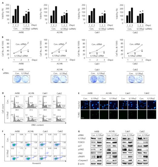In 229 cases of human RCC, a significant association between the expression IL13Rα2 and poor prognosis was observed by tissue microarray. Hence, as the next step, we tried to investigate the possible oncogenic role of IL13Rα2 by performing in vitro assays for cell proliferation, cell cycle arrest, and apoptosis in RCC cells after transfection of siRNA against IL13Rα2. WST-1 and cell counting assay were conducted to evaluate the antiproliferative activity of the knockdown of IL13Rα2. Cells were transfected with control or siRNA against IL13Rα2 and incubated for the indicated time. As shown in Figure 3A,B, compared to the control, cells transfected with siRNA against IL13Rα2 showed a decreased proliferation rate, which was confirmed by performing colony formation assay (Figure 3C). Cell cycle analysis showed that knockdown of IL13Rα2 with siRNA increased G2/M population in A498, ACHN, Caki1, and Caki2 cells compared to control siRNA (Figure 3D). TUNEL and annexin V staining assay results showed that knockdown of IL13Rα2 with siRNA increased the apoptosis in A498, ACHN Caki1, and Caki2 cells compared to control siRNA (Figure 3E,F). Western blotting analysis indicated that knockdown of IL13Rα2 with siRNA increased the expression of cleaved PARP1, cleaved caspase3, FOXO3, and p27 (Figure 3G). Overall, these results indicate that knockdown of IL13Rα2 with siRNA transfection could regulate proliferation, cell cycle arrest, and apoptosis in A498, ACHN, Cak1, and Caki2 RCC cells.