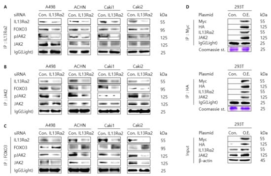 In the previous report, we found that pJAK2 interacts with FOXO3, which was regulated by type II IL4R and IL13Rα1 heterodimeric receptor complex [21]. Since IL13Rα2 can accept IL13 as the same ligand with type II IL4R and IL13Rα1 complex, we examined whether the phosphorylation level of JAK2 was regulated by knockdown of siRNA against IL13Rα2 in RCC cells. When A498, ACHN, Caki1, Caki2, and 293T cell lysates were analyzed by Western blotting for IL13Rα2, pJAK2, JAK2, and FOXO3, there seemed the correlation pattern between IL13Rα2 and pJAK2 except for Caki2 cell lysates (Supplementary Figure S1A). In contrast, the expression of pJAK2 and FOXO3 was reversely correlated. In addition, as shown in Figure 3G, the expression of pJAK2 was significantly downregulated by transfection of IL13Rα2 with siRNA in A498, ACHN Caki1, and Caki2 cells compared to control siRNA. Then, to investigate the protein interaction among IL13Rα2, pJAK2, and FOXO3, we performed co-immunoprecipitation experiments with an antibody against IL13Rα2, JAK2, and FOXO3 followed by immunoblot analysis with an antibody against IL13Rα2, pJAK2, JAK2, and FOXO3 in A498, ACHN Caki1, and Caki2 cells transfected with siRNA against IL13Rα2. As shown in Figure 4A–C, the protein interaction among IL13Rα2, pJAK2 and FOXO3 was weakened in RCC cells transfected with siRNA against IL13Rα2 compared to the control siRNA. Furthermore, we could observe that the level of protein interaction between IL13Rα2 and JAK2 was increased in 293T cells co-transfected with overexpression plasmid DNA for IL13Rα2 or JAK2 (Figure 3D). Collectively, these results implicate that IL13Rα2 interacts with JAK2, which may regulate the protein expression level of FOXO3.