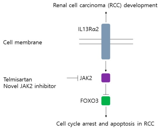 In this study, we investigated the clinical implication and oncogenic role of IL13Rα2 in RCC progression. Interestingly, IL13Rα2 seemed to increase the phosphorylation of JAK2 and decrease the expression of FOXO3. These results suggest that IL13Rα2 regulates RCC progression through JAK2/FOXO3-signaling pathway. Since JAK2 was regulated by IL13Rα2 and type II IL4Rα and IL13Rα1 complex, we tried to screen an FDA-approved drug library with a JAK2 kinase assay kit to identify the novel candidates that were possibly inhibiting JAK2 in RCC cells. Here, we show that telmisartan has the potential for antiproliferative activity in RCC cells, which could broaden the therapeutic options for RCC patients.