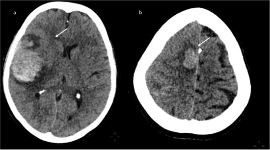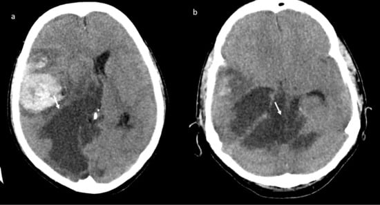 Brain computed tomography (CT) scan: presence of multiple subacute intra-axial hemorrhages in atypical locations (a,b).