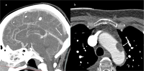 CT-angiography: partial thrombosis of the vein of Galen (a); presence of a floating thrombus within the aortic arch (b).