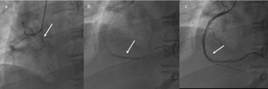 Plain Old Balloon Angioplasty (POBA) of the right coronary artery (a–c): restoration of the distal flow, with persistence of extensive thrombosis.