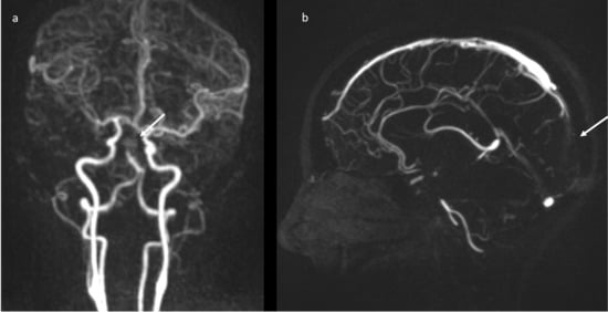 MR-angiography: acute basilar thrombosis associated with superior coronal (a) and sagittal (b) sinus thrombosis.