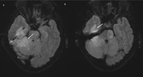 Brain MRI (DWI): acute ischemic lesion with restricted diffusion involving the pons, mesencephalon, the right superior cerebellar hemisphere with the vermis (a), and the right posterior temporal lobe (b).