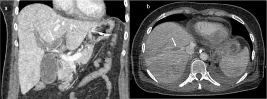 CT scan; in (a) MPR (arrow shows thrombosis of the left portal branch) and in (b) axial plain during portal phase arrow shows thrombosis if the right (Figuer suprahepatic vein).