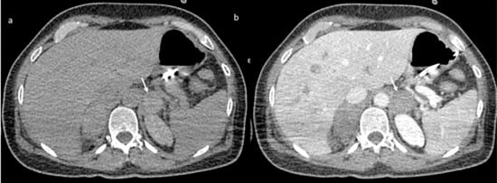 CT scan without (a) and with contrast (b) shows adrenal hemorrhage (arrow).