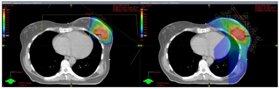 - Vicini, F.A.; Remouchamps, V.; Wallace, M.; Sharpe, M.; Fayad, J.; Tyburski, L.; Letts, N.; Kestin, L.; Edmundson, G.; Pettinga, J.; et al. Ongoing clinical experience utilizing 3D conformal external beam radiotherapy to deliver partial-breast irradiation in patients with early-stage breast cancer treated with breast-conserving therapy. Int. J. Radiat. Oncol. Biol. Phys. 2003, 57, 1247–1253. [Google Scholar] [CrossRef]