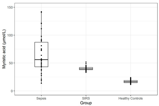 The major limitation of the study is a low number of subjects in the Sepsis and SIRS Groups. The Control Group, on the other hand, is in our view a well-defined homogenous population, and the observed myristic acid levels produce quite robust evidence of normal/physiological concentration.