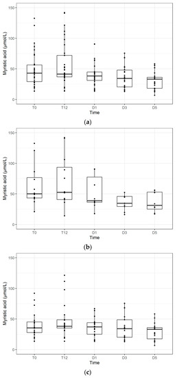 Median values of myristic acid for the respective groups and time points are presented in Table 4.