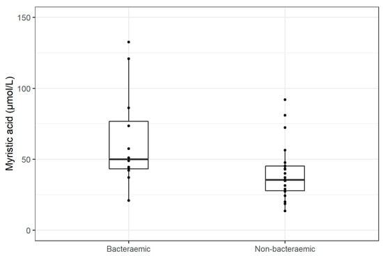 The serum concentration of myristic acid in septic patients with bacteraemia at T0 was higher than in septic patients without bacteraemia (p = 0.016), Figure 3.