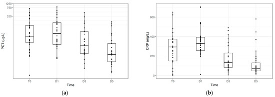 Serum concentrations of procalcitonin (a) and C-reactive protein (b) at individual times.