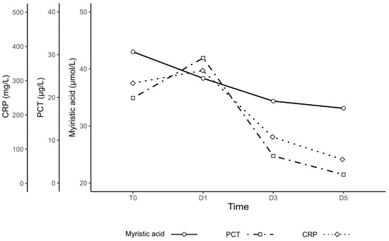 CRP and PCT kinetics where typical for sepsis (see Figure 4). Figure 5 compares the CRP, PCT, and myristic acid levels in time.