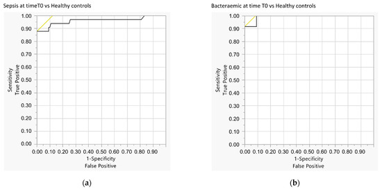 Comparing the Sepsis Group patients at T0 with the Healthy Control Group, the ROC analysis identified a myristic acid concentration of 24.3 µmol/L (AUC 0.961) as the cut-off value for prediction of sepsis with 87.9% sensitivity and 100% specificity (see Figure 6a).