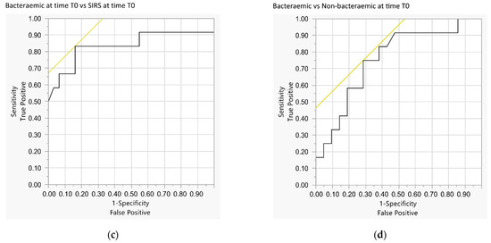 ROC curves for comparisons of selected groups: (a) Septic patients on admission vs. healthy controls; (b) septic patients with bacteraemia on admission vs. healthy controls; (c) septic patients with bacteraemia on admission vs. SIRS patients on admission; and (d) septic patients with bacteraemia on admission vs. septic patients without bacteraemia on admission.