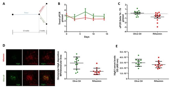 (A) Twelve-week-old mice were given 100 mg/kg of Rifaximin or of olive oil by oral gavage for two weeks before sacrifice. (B) Trend of uPCR from 12 weeks to sacrifice. (C) uPCR Delta t3-t0, where t3 is the uPCR after two weeks of treatment and t0 is uPCR before starting antibiotic or vehicle. (D) Representative sections of kidneys after immunostaining with anti-hIgA-FITC antibody and Phalloidin–Alexaflour 564 to underline glomerular structures (green anti-hIgA1, red phalloidin) and the ratio between the glomerular area positive for hIgA1 and total area of the glomerulus, measured using ImageJ. (E) hIgA serum level measured by ELISA in mice that received antibiotics or vehicle and compared using the Mann–Whitney test.