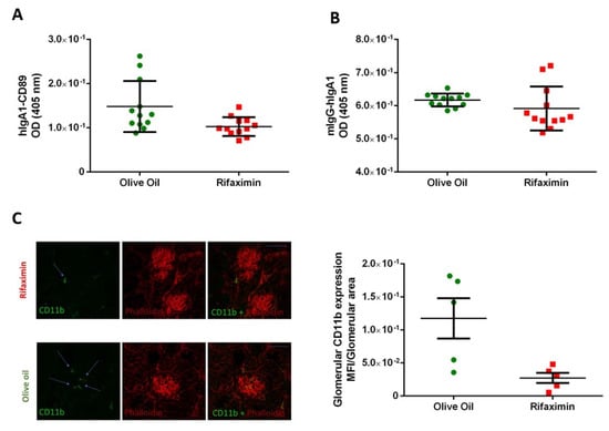 In contrast, mice in the antibiotic group showed less hIgA1-CD89 (Figure 2A, p* = 0.0145) and mIgG-hIgA1 complexes (Figure 2B, p* = 0.0447) than the control group. To evaluate the effect of rifaximin on kidney inflammation in the IgAN mice model, we assessed the immunofluorescence to analyze whether rifaximin affects CD11b+ renal infiltration. The antibiotic reduced the development of glomerular inflammation as illustrated by less CD11b-positive area normalized for the total glomerular area (Figure 2C, p* = 0.0317).