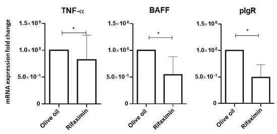 It has been shown that epithelial-derived BAFF is the major modulator of B cell development and it has a key role in IgA class switching and plasma cell survival in the MALT [14,15]. Consistent with the effect of rifaximin on renal inflammation, mice treated with this antibiotic present a significant decrease of TNF-α, BAFF, and pIgR mRNA gut expression when compared to the control group (respectively p* = 0.0369, p* = 0.0490, p* = 0.0271). TNF-α, BAFF, and pIgR mRNA expression levels are illustrated in Figure 3.