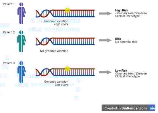 Polygenic Risk Scores test can predict the risk of developing a disease according to the score of the genomic variation investigated. Image created with BioRender.com (accessed on 1 March 2021).