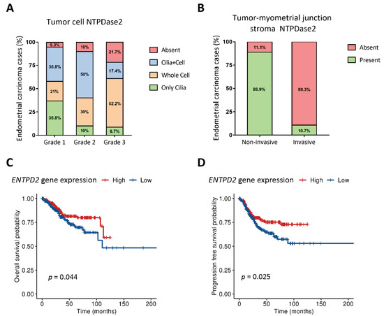 Kaplan–Meier for overall-survival probability and the progression-free survival ratios were calculated for a cohort of patients diagnosed with endometrial carcinoma of endometrium from TCGA. Gene analysis revealed two groups: cases with high and those with low ENTPD2 expression. We compared the survival probabilities of the two groups (Figure 2C,D).