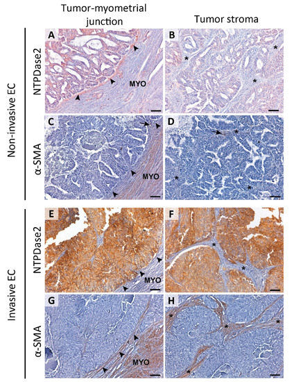 Immunolocalization of NTPDase2 and α-SMA in the stroma of non-invasive (A–D) and invasive ECs (E–H). NTPDase2 was immunodetected in the stromal cells located in the tumor-myometrial junction (A; arrowheads) of non-invasive EC, but not in the rest of the stroma (B; * asterisks). In these tumors, α-SMA expression was not detected either in tumor-myometrial junction stroma (C; arrowheads) or in the rest of the stroma (D; * asterisks), except in pericytes enwrapping some vessels (C,D; arrows). In invasive EC, the absence of NTPDase2 expression in stroma was generalized in the tumor-myometrial junction (E; arrowheads) as well as in the rest of the stroma (F; * asterisks). Conversely, the immunodetection of α-SMA was extended to tumor-myometrial junction (G; arrowheads) as well as to the rest of the stroma (H; * asterisks). Scale bars are 100 µm. MYO: myometrium.