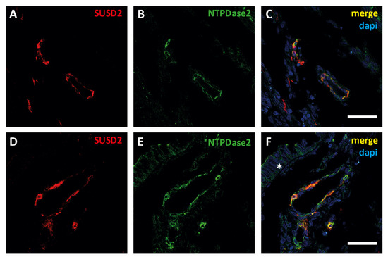 Confocal fluorescence images of different zones of a section of an EC sample with antibodies against sushi domain containing 2 (SUSD2, red, A,D) and NTPDase2 (green, B,E). Merged images (yellow, C,F) show the colocalization of SUSD2 with NTPDase2 in cells surrounding blood vessels in the tumor. Moreover, NTPDase2 was also detected in the tumor cells (F, * asterisk). Nuclei were labeled with DAPI (blue, C,F). Scale bars are 50 µm.