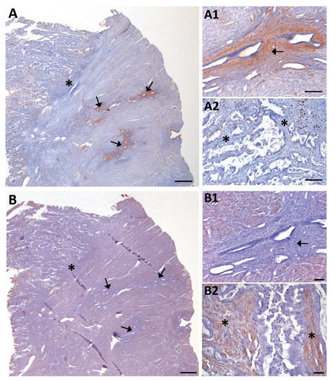 NTPDase2 (A) and α-SMA (B) immunolabeling of consecutive sections of a case of invasive EC coexistent with adenomyotic lesions (arrows). (A1,A2) and (B1,B2) are details of (A) and (B) respectively. Adenomyosis in the myometrium appeared as non-pathologic endometrial glands surrounded by endometrial stroma expressing NTPDase2 (A1; arrow). Conversely, α-SMA was not detected in the endometrial stromal cells of adenomyotic lesions (B1; arrow). NTPDase2 was not expressed in the stroma of the tumor (A2; * asterisks), while α-SMA was present (B2; * asterisks). Scale bars are 1 mm (A,B), 100 µm (A1,A2,B1) and 50 µm (B2).