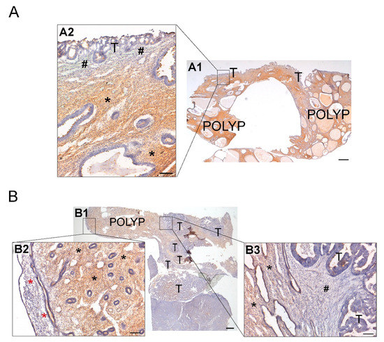 Immunodetection of NTPDase2 in two cases of ECs coexisting with endometrial polyps (endometrial non-tumoral tissue) (A,B). (A1) Invasion of endometrial polyp by serous carcinoma. Invasive tumor cells (T) appeared surrounded by stromal cells lacking NTPDase2 (A2; # pound signs), while endometrial stromal cells of endometrial polyp showed NTPDase2 label (A2; * asterisks). (B1) Invasion of endometrial polyp by grade 1 endometrioid endometrial carcinoma (EEC). Image (B2) shows the functional layer of endometrium with a negative stroma for NTPDase2 (* red asterisks). NTPDase2 was immunodetected in the endometrial stroma of endometrial polyp (B2,B3; * black asterisks). Desmoplastic stroma surrounding invasive endometrial tumor cells did not show NTPDase2 label (B3; # pound sign). Scale bars are 1 mm (A1,B1) and 100 µm (A2,B2,B3). T: tumor cells; POLYP: endometrial polyp.
